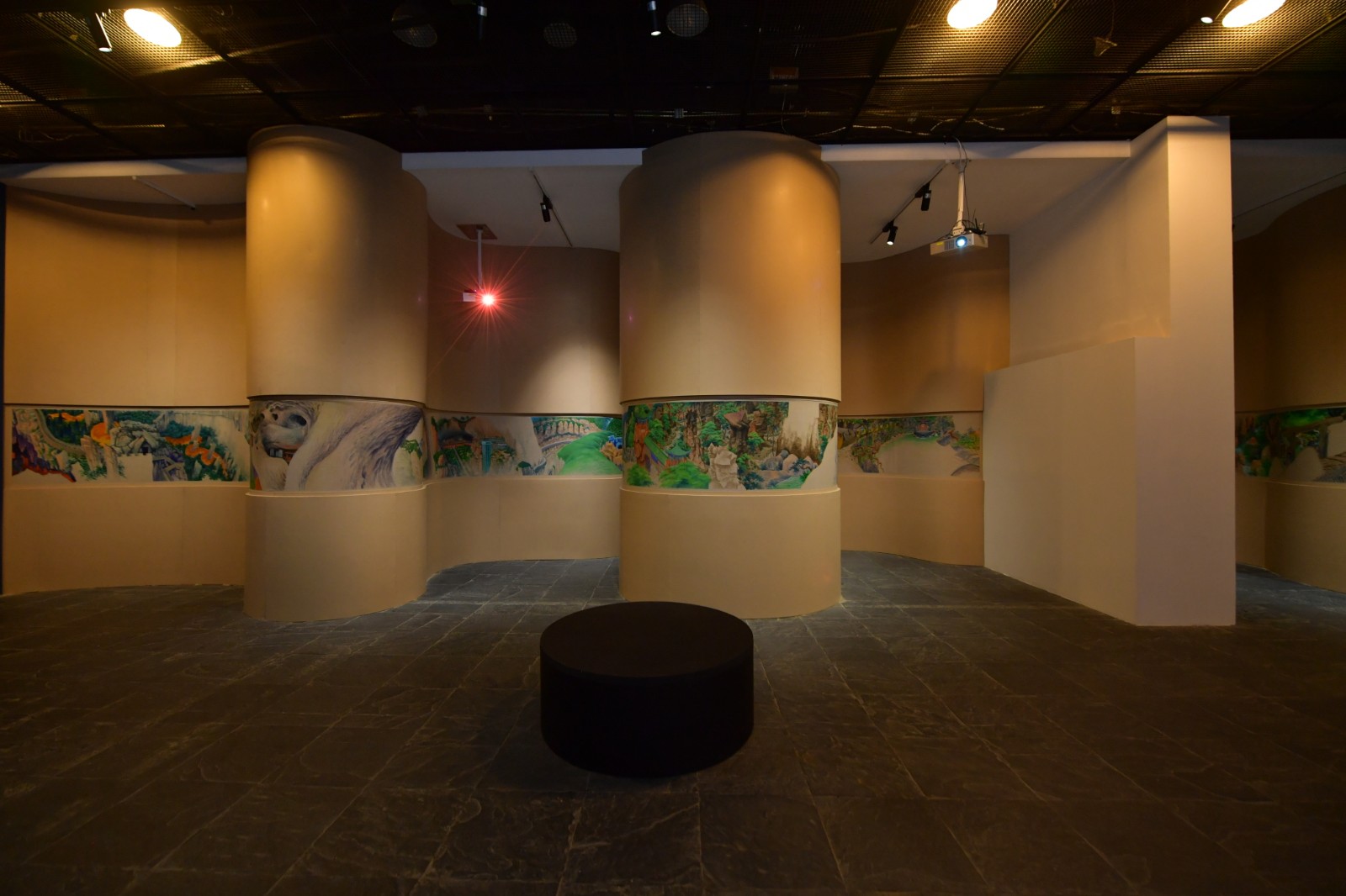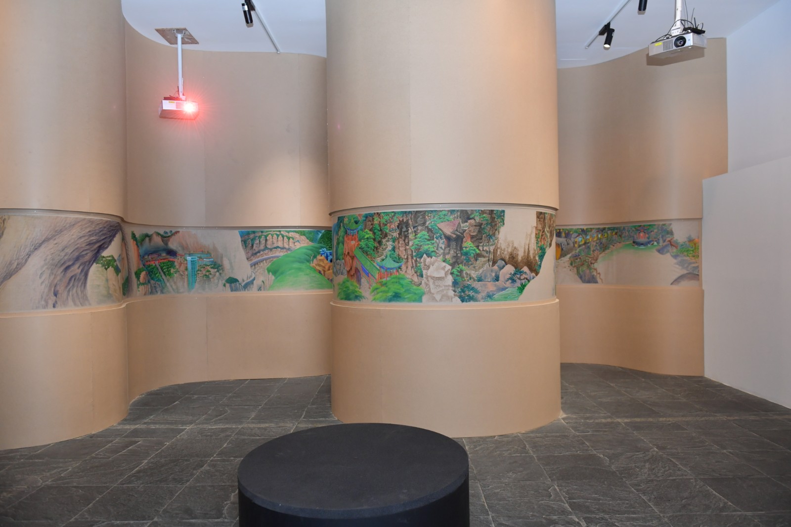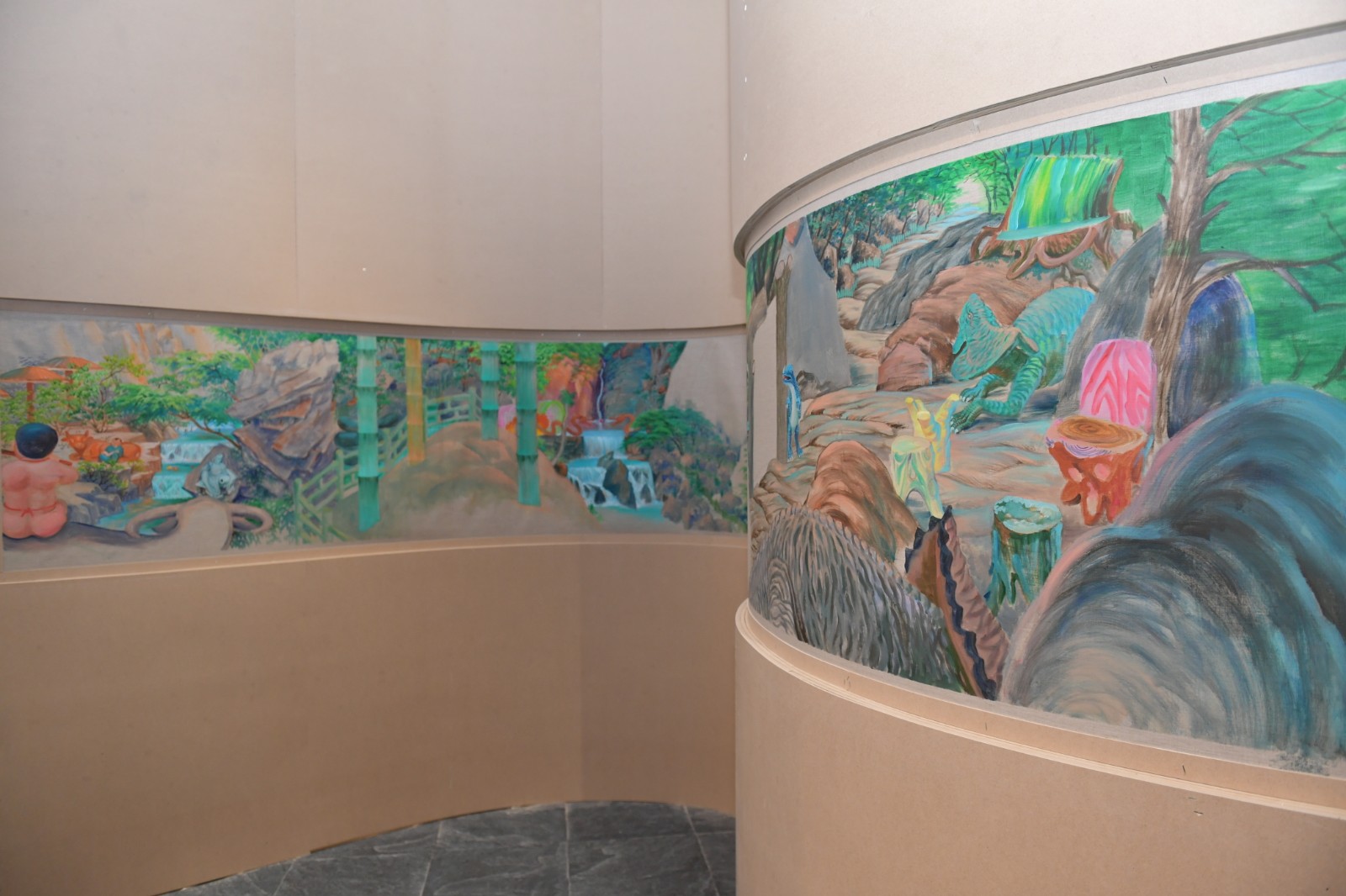 “地洞”一旁是展廳的下沉區(qū)域,這里被策展人設(shè)計為去往“桃花源”的實體路徑。梁碩的《景了個區(qū)》出現(xiàn)在這個下沉空間的一排四個口袋式的連續(xù)隔間墻面上,從空間上來說是無比契合的?;仡櫫捍T2019年在北京公社的展覽《梁碩:景區(qū)》同樣可以見到這樣一種迂回的觀展路徑?!熬皡^(qū)”這個概念的提出,在藝術(shù)家看來代表著今天人們對山水的理解,這個獨特的概念跨越了自然景觀與都市空間。梁碩在自己撰文的《景了個區(qū)》中復(fù)原了一個景區(qū)籌備建立起來的小故事,承包景區(qū)改造的劉工在工期接近尾聲時,看到自己的“杰作”時不由感嘆:“這些水泥造物,居然都妥妥的在那了,像是本來就是從山里長出來的,那巨大的假山石和假樹根顯得造型怪異,卻頗得陳老蓮氣韻,在落日的余暉中與真山融為一體,真山也像了假山……”[6]景區(qū)的建立勢必意味著人工、商業(yè)、消費對自然景觀的直接侵入與改造,空間、審美、意識形態(tài)等一系列問題由此發(fā)生。