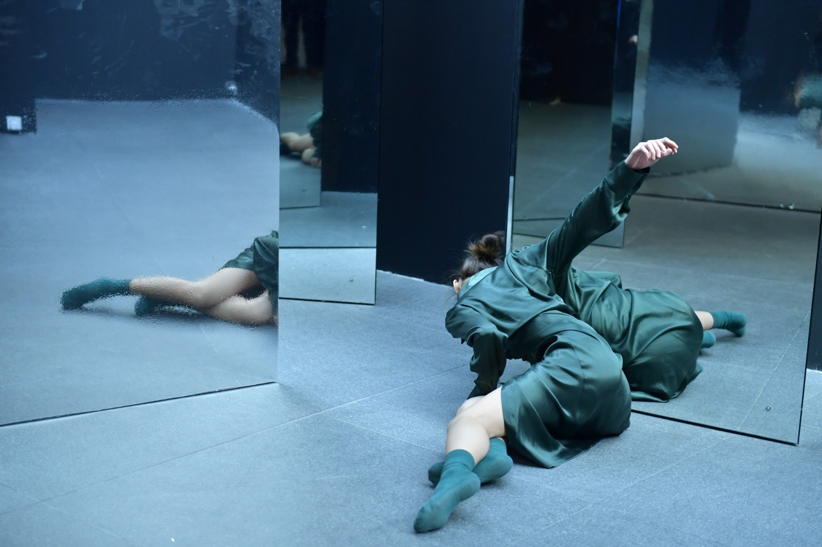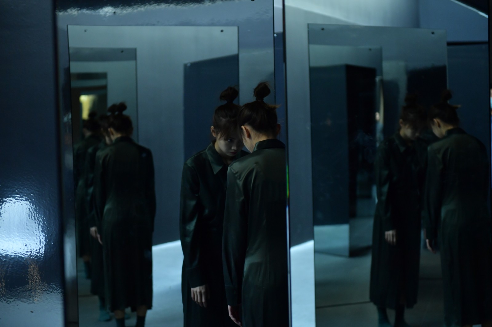 在OCAT研究中心展廳最明亮而寬闊的長走廊上,紙老虎工作室借助六個鏡面反射的三棱柱營造了一個劇場式的空間,邀請觀眾進(jìn)入并參與到劇目的演繹與發(fā)展中來。鏡面反射著“我”和周圍的環(huán)境,清晰地呈現(xiàn)著“我”在環(huán)境中的位置。