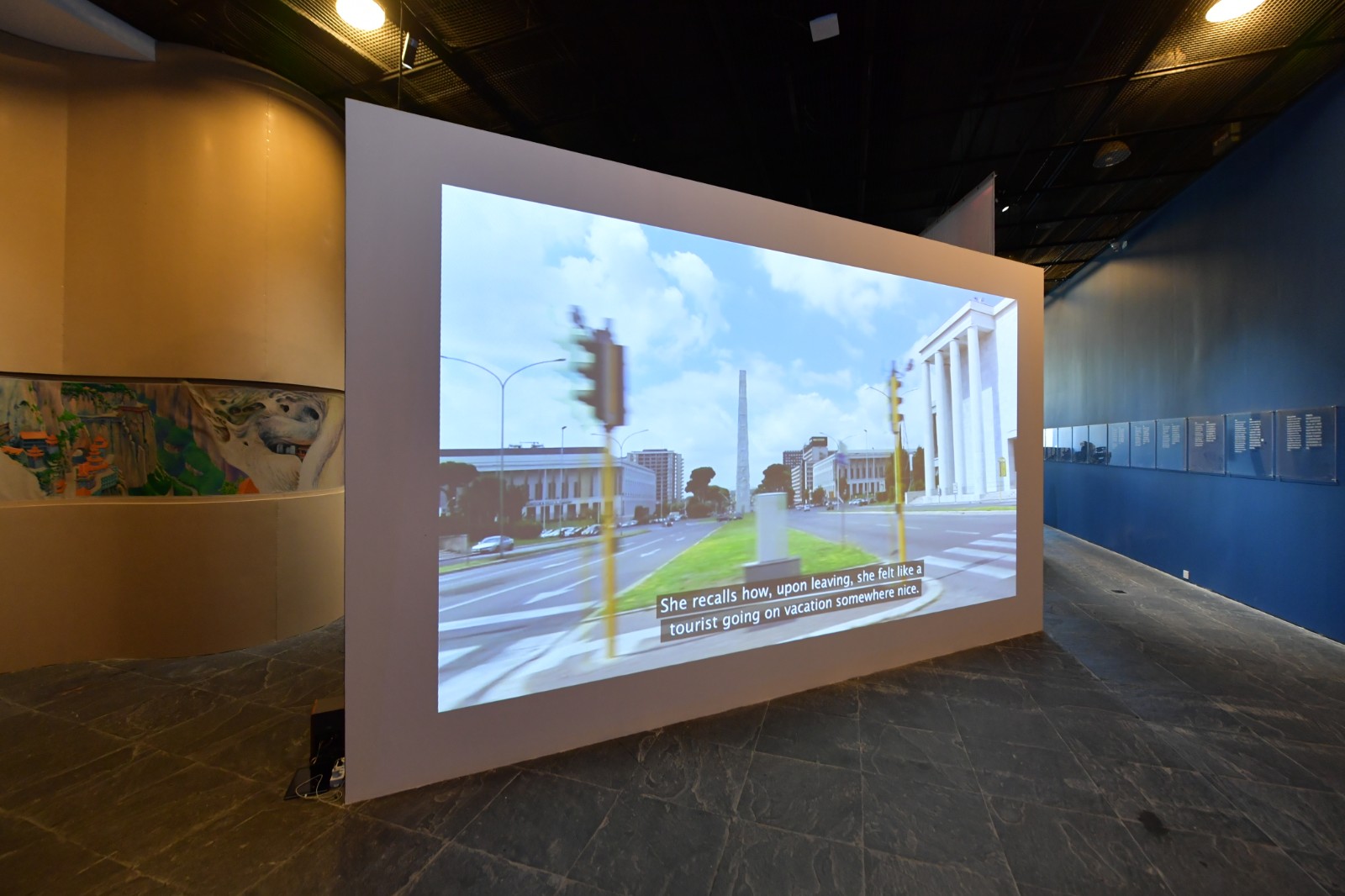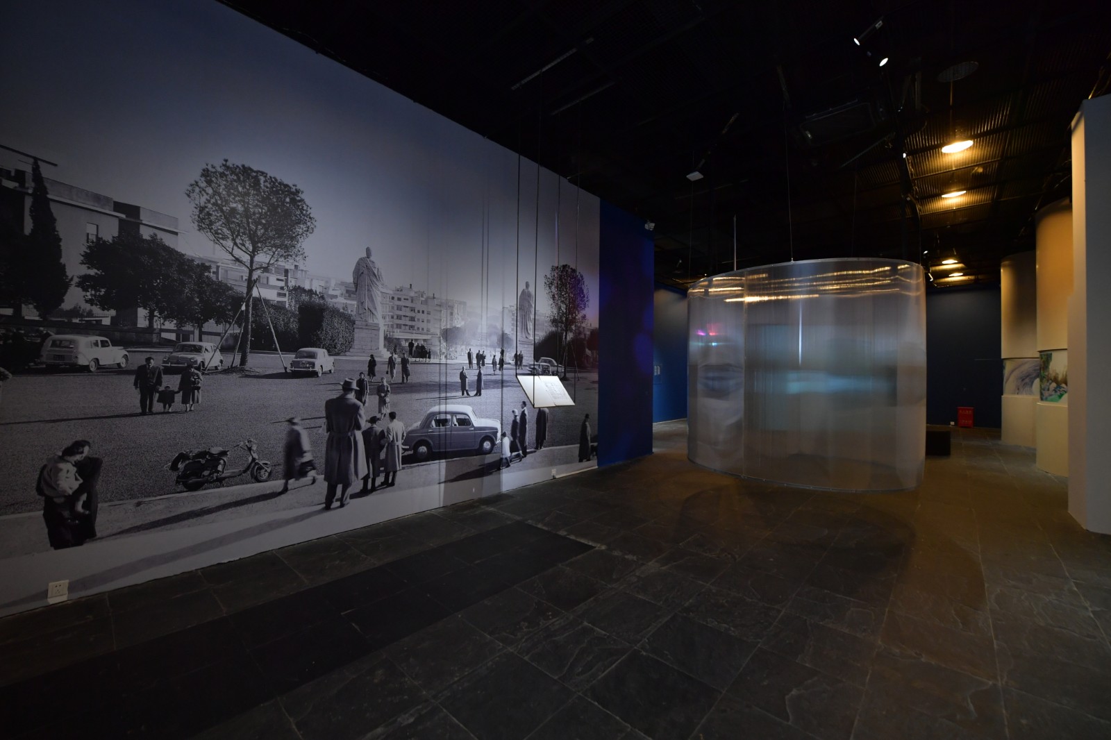 臺階的最上方引導(dǎo)著觀眾走向迷宮的“出口”——那是一個陽臺,它被認(rèn)為跨越了私人領(lǐng)域和公共領(lǐng)域之間的那條不甚明晰的界限。人們在登上陽臺的那一瞬間,目之所及的是胡偉呈現(xiàn)的“廣場”。在《為公共口口(邂逅),提案》中,胡偉對自己家鄉(xiāng)的廣場進(jìn)行了調(diào)研,廣場中心紀(jì)念碑雕塑的拆除背后是對一段宏觀歷史的回顧,展柜中陳列的文獻(xiàn)材料,3D打印復(fù)原的紀(jì)念碑與噴泉,都以一種最傳統(tǒng)的方式印證著這段歷史的發(fā)生與存在。而在面向陽臺的視頻圖像語境中,胡偉通過鏡頭的聚焦切換與角度變化,在宏觀的歷史背景外,其似乎在試圖提煉除一種模糊的普遍性,其適用于廣泛的公共空間與集體記憶,卻與人們的個體記憶都有不謀而合之處,但又難以捕捉,“沒有面目,也無人認(rèn)領(lǐng)”。