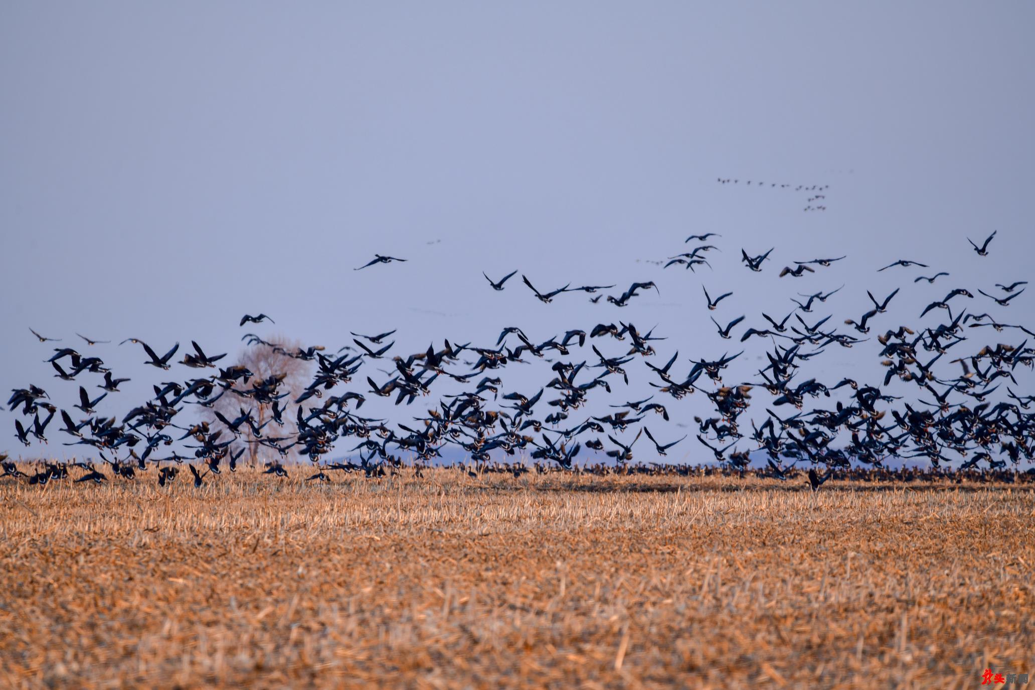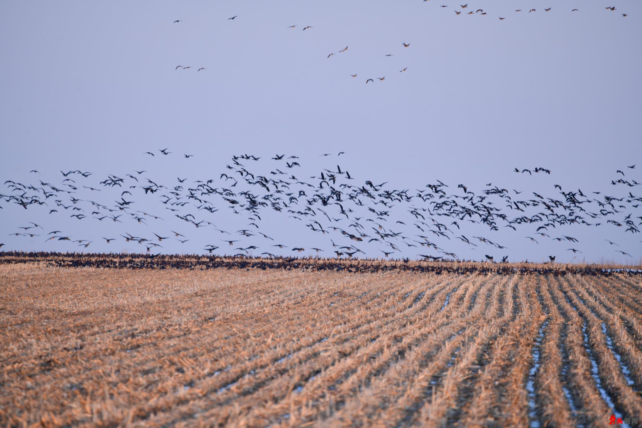 候鳥(niǎo)們有的聚集在剛剛化凍的湖邊,有的聚集在興凱湖閘門(mén)流水口附近的活水中,更多的則群集在興凱湖附近的水田地或沼澤地里。