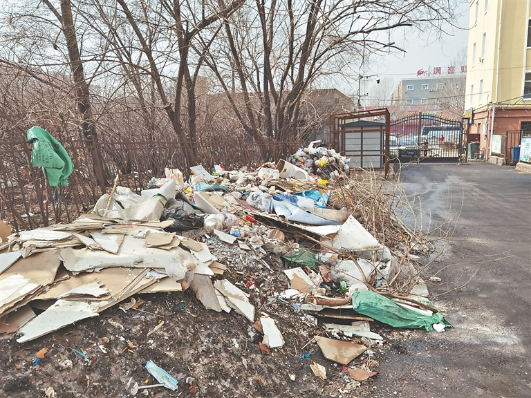 南崗區(qū)學(xué)府路300號(hào)至308號(hào)之間,是一片改造后的老舊小區(qū),一側(cè)大門還有戴紅袖標(biāo)的人員看守。進(jìn)入后,道路一側(cè)出現(xiàn)了垃圾帶,生活垃圾、裝修垃圾、放棄雜物和殘冰殘雪,堆出了20米的“長(zhǎng)龍”。據(jù)這里的居民介紹,小區(qū)沒有物業(yè),衛(wèi)生由街道管理?!坝捎陂L(zhǎng)期不外運(yùn),天熱的時(shí)候,這里的垃圾會(huì)很臭。其實(shí)小區(qū)環(huán)境還不錯(cuò),就是缺少管理?!?/span>