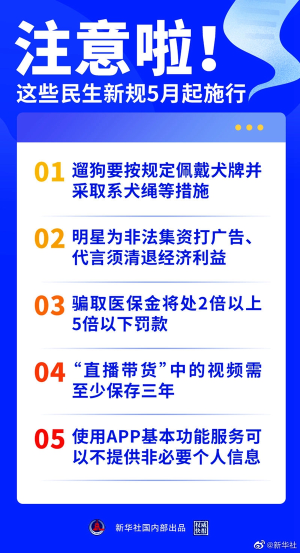 五一假期將如約而至,一批新規(guī)也將于5月1日開始施行。遛狗要系繩、騙醫(yī)保金要罰款、名人為非法集資打廣告要退回酬勞……法治陽光更普照,社會(huì)生活更美好。來看看,哪一條切中了你的關(guān)心事?(新華社記者白陽 海報(bào)設(shè)計(jì)楊軼群)