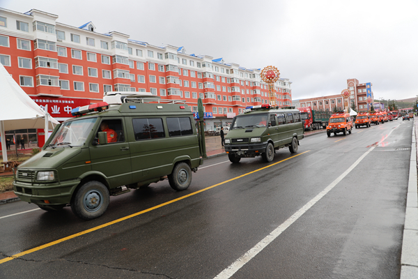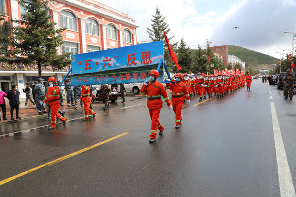 9時,反思活動正式開始。林業(yè)局處級領(lǐng)導(dǎo)與職工群眾鄭重地在在“牢記歷史 汲取教訓(xùn) 振奮精神 開拓進(jìn)取 建設(shè)美麗藍(lán)莓小鎮(zhèn)”宣傳條幅上,鄭重地簽上了自己的名字。并舉行了聲勢浩大的人員游行、車輛游行。由運(yùn)兵車、運(yùn)兵車、人工增雨車等26臺特種車輛,拉響警報(bào),緊跟在由森林消防大隊(duì)組成的100余人步行方陣后,他們身穿防火戰(zhàn)斗服,手舉寫有“‘五?六’反思”巨型防火宣傳牌和防火宣傳彩旗,尤其是手執(zhí)高速渦流噴射滅火機(jī)、脈沖槍、斯蒂爾風(fēng)力滅火機(jī)的隊(duì)員,邁著整齊的步伐,喊著響亮的口號,立即吸引了過往的居民的注意,成為最亮眼的“明星”。