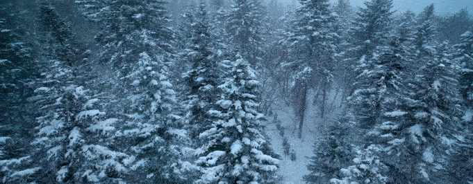 大幕拉開(kāi),風(fēng)雪交加,一望無(wú)際的茫茫林海里,是故事的開(kāi)局之地。航拍第一視角的真實(shí)感鏡頭為我們呈現(xiàn)出開(kāi)局的困頓感和林海雪原環(huán)境的壯美大氣。