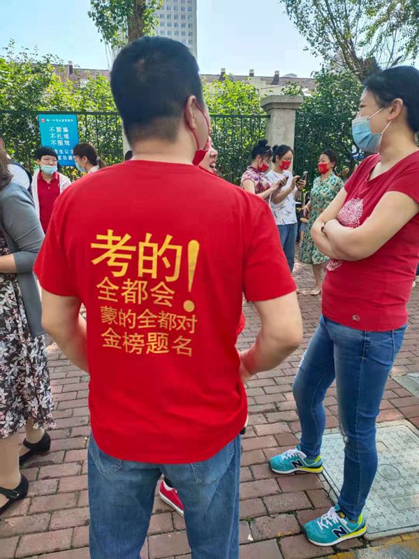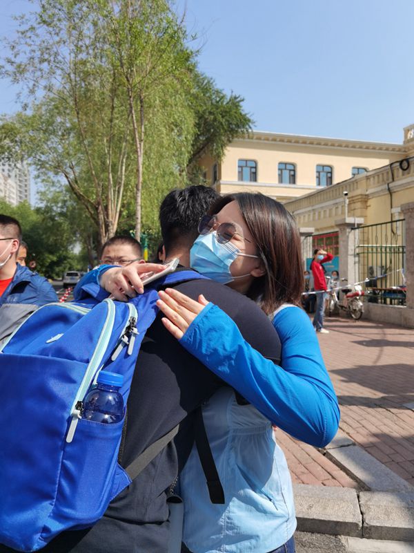 站在學(xué)校門(mén)前的哈市第一中學(xué)化學(xué)何老師通過(guò)擁抱為考生助威。