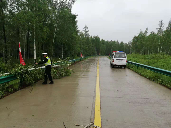 交警大隊派出警力增援北極中隊,擴大巡邏范圍,及時排查發(fā)現(xiàn)G111、G331國道、景區(qū)周邊路段交通隱患。在北極村至北紅村路段,發(fā)現(xiàn)由于暴雨沖刷,該路段3處山石、樹枝堆積在路面,2處樹木刮倒,嚴重影響路面通行安全。巡邏民警立即對險情進行處置。針對3處漫水較為嚴重區(qū)域,設置警戒線等警示標志,告知過往車輛通行路況,提醒車輛減速慢行,同時通知相關部門及時處置。