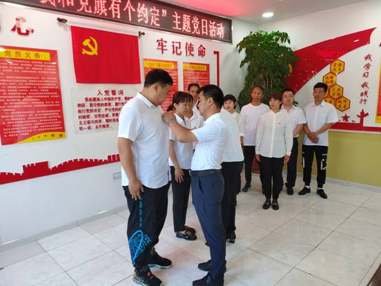 在馬林林場分會場,2名老黨員正在為預(yù)備黨員佩戴黨徽,這光榮的儀式對于新黨員來說是一種榮譽、一種激勵、一種鞭策,更是中國共產(chǎn)黨人精神的傳承。