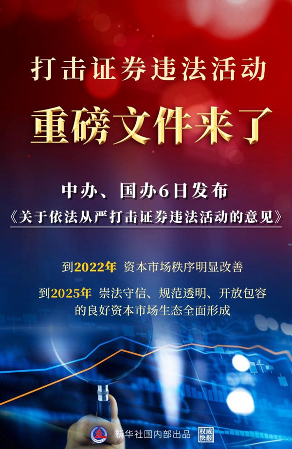新華社北京7月6日電(記者張千千 劉慧)中共中央辦公廳、國務院辦公廳6日公開發(fā)布了《關于依法從嚴打擊證券違法活動的意見》,對建立健全資本市場執(zhí)法司法體制機制、依法從嚴打擊證券違法活動、推動資本市場高質量發(fā)展作出重要部署。
