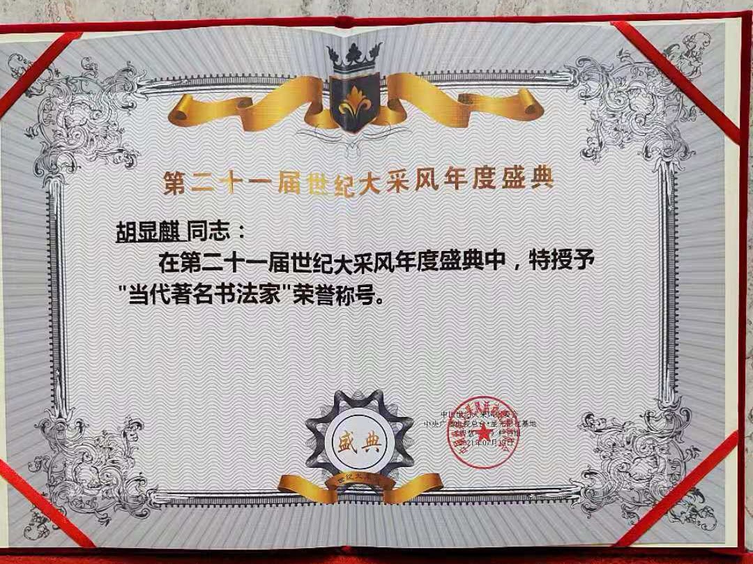 在第二十一屆世紀(jì)大采風(fēng)年度盛典中,特授予“當(dāng)代著名書法家”榮譽(yù)稱號(hào),多次參加在海南三亞和北京全國(guó)政協(xié)大禮堂舉行的頒獎(jiǎng)典禮。