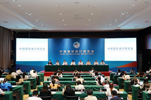 這是第四屆進(jìn)博會(huì)開幕倒計(jì)時(shí)100天新聞通氣會(huì)現(xiàn)場(chǎng)(7月26日攝)。新華社記者 方喆 攝