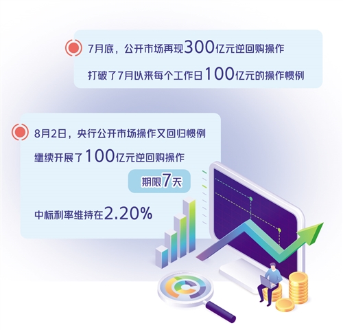 7月底,公開市場再現(xiàn)300億元逆回購操作,打破了7月以來每個(gè)工作日100億元的操作慣例。7月29日、30日,中國人民銀行連續(xù)發(fā)公告稱,為維護(hù)月末流動性平穩(wěn),以利率招標(biāo)方式開展了300億元逆回購操作,期限7天,中標(biāo)利率維持在2.20%不變。