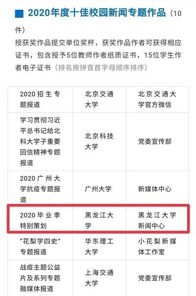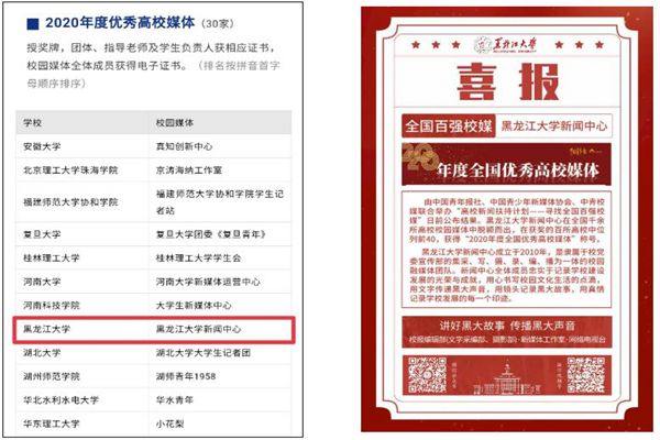 據(jù)了解,在此次全國百強校園媒體評比中,黑龍江大學新聞中心位列前40,獲評“2020年度全國優(yōu)秀高校媒體”稱號,創(chuàng)造了該校參評以來的最好成績。