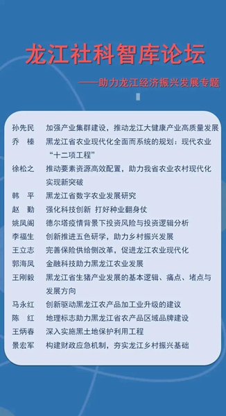 省經(jīng)濟(jì)學(xué)會會長、哈爾濱商業(yè)大學(xué)黨委書記孫先民教授結(jié)合龍江老齡化問題,從產(chǎn)業(yè)集群視角積極為龍江大健康產(chǎn)業(yè)高質(zhì)量發(fā)展建言獻(xiàn)策。省經(jīng)濟(jì)學(xué)會副會長、黑龍江大學(xué)經(jīng)濟(jì)與工商管理學(xué)院黨委書記喬榛教授從國家糧食安全政治責(zé)任和促進(jìn)農(nóng)業(yè)高質(zhì)量發(fā)展兩方面,對龍江現(xiàn)代農(nóng)業(yè)“十二項(xiàng)工程”進(jìn)行全面系統(tǒng)的剖析。省社會科學(xué)院農(nóng)村發(fā)展研究所所長趙勤教授分析了科技創(chuàng)新對“現(xiàn)代種業(yè)提升工程”的重要性。中共黑龍江省委黨校王炳春研究員指出了龍江在推進(jìn)“黑土地保護(hù)利用工程”中存在的問題,并提出構(gòu)建保護(hù)利用黑土地的長效機(jī)制和保護(hù)措施。哈爾濱工程大學(xué)經(jīng)濟(jì)管理學(xué)院馬永紅教授指出,創(chuàng)新驅(qū)動能夠有效推動“農(nóng)產(chǎn)品加工業(yè)升級工程”。東北林業(yè)大學(xué)經(jīng)濟(jì)管理學(xué)院陳紅教授圍繞“農(nóng)業(yè)品牌創(chuàng)建工程”,指出龍江地理標(biāo)志農(nóng)產(chǎn)品區(qū)域品牌建設(shè)存在的問題,并提出相應(yīng)對策。黑龍江省產(chǎn)權(quán)交易集團(tuán)董事會秘書徐松之提出,要充分發(fā)揮市場中要素資源的配置作用,提高要素資源配置效率。省經(jīng)濟(jì)學(xué)會副會長,哈商大經(jīng)濟(jì)學(xué)院院長韓平教授提出,打造龍江數(shù)字農(nóng)業(yè)要通過推動農(nóng)產(chǎn)品流通數(shù)字化、構(gòu)建農(nóng)業(yè)大數(shù)據(jù)體系、完善數(shù)字化基礎(chǔ)設(shè)施等多條路徑。哈商大金融學(xué)院院長姚鳳閣教授提出,疫情下投資風(fēng)險與投資邏輯都發(fā)生了變化,其中對農(nóng)業(yè)企業(yè)的不利沖擊已經(jīng)波及到全產(chǎn)業(yè)鏈。哈爾濱金融學(xué)院投資保險系主任王立志教授提出,通過金融供給側(cè)改革,利用“保險+期貨”的方式,能夠顯著降低上市生產(chǎn)的自然風(fēng)險和市場風(fēng)險。哈爾濱工業(yè)大學(xué)經(jīng)濟(jì)與管理學(xué)院郭海鳳教授建議要抓住金融科技發(fā)展機(jī)遇,推動區(qū)塊鏈技術(shù)在農(nóng)產(chǎn)品銷售溯源中的發(fā)展和應(yīng)用,通過降低信息不對稱,打造龍江糧倉的品牌優(yōu)勢。省經(jīng)濟(jì)學(xué)會副會長、哈爾濱金融學(xué)院黨委書記劉小輝教授在作總結(jié)發(fā)言時說,專家們的意見和建議,對于全面推進(jìn)鄉(xiāng)村振興、加快農(nóng)業(yè)農(nóng)村現(xiàn)代化、促進(jìn)龍江經(jīng)濟(jì)發(fā)展將發(fā)揮重要作用。