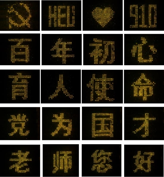 黨徽、HEU(哈工程縮寫(xiě))、愛(ài)心、9.10、百年初心、育人使命、為黨育人、為國(guó)育才、老師您好……同學(xué)們匯聚力量共同拼出了24組圖案和字樣,即使天空飄起毛毛細(xì)雨,他們也絲毫沒(méi)有變換位置,在雨中足足站了兩個(gè)小時(shí)。2021級(jí)博士生王文軒感慨:“作為一名本、碩都就讀于哈工程的學(xué)生,這所大學(xué)的老師教會(huì)了我如何做人做事做學(xué)問(wèn),我們用這場(chǎng)燈光秀,獻(xiàn)禮我們最尊敬的老師,我們也一定會(huì)傳承哈軍工精神,勇?lián)鷱?qiáng)國(guó)百年使命擔(dān)當(dāng)。”