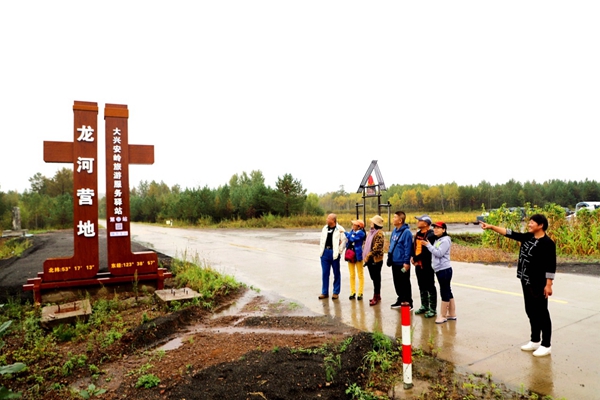 阿木爾林業(yè)局職工、微商何喜燕(右一)向粉絲介紹龍河林場旅游地標(biāo)