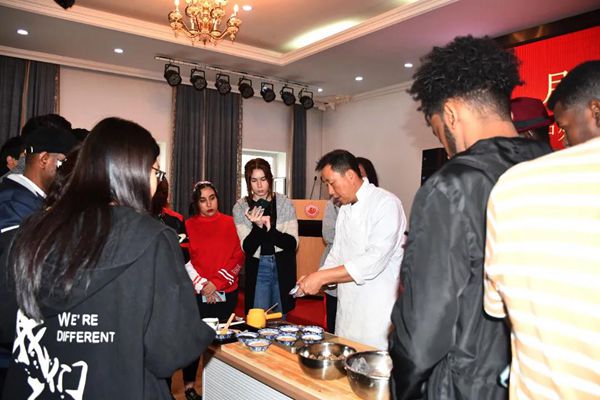 本次活動(dòng)以中國(guó)傳統(tǒng)文化為主線,中外學(xué)生們一起做月餅、品詩(shī)詞、賞民樂(lè)、講中國(guó)故事,在感受“中國(guó)味道”的同時(shí),體驗(yàn)中國(guó)中秋傳統(tǒng)文化。在中國(guó)傳統(tǒng)特色表演、“月亮”意象解讀、“月餅”文化介紹、誦讀中秋古典詩(shī)詞等多種體驗(yàn)式互動(dòng)中,留學(xué)生們深刻地了解了中秋節(jié)的起源和文化意義,學(xué)習(xí)到中秋月餅、月亮、嫦娥、兔子等所蘊(yùn)含的美好祝福,共同體會(huì)中華文化的特色與魅力。伴隨著喜慶團(tuán)圓的樂(lè)曲,留學(xué)生們和指導(dǎo)老師一起親手制作月餅,開(kāi)水和面、按壓面團(tuán)、揉搓餡料、放入模具定型。不一會(huì)兒,一塊塊帶有“敦品勵(lì)學(xué)、弘毅致遠(yuǎn)”校訓(xùn)的各種口味的月餅就呈現(xiàn)在大家面前,留學(xué)生們興奮地拿起自己親手制作的月餅合影留念。