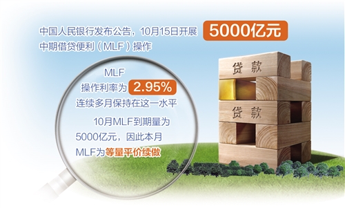 10月15日,月中“麻辣粉”(MLF)如期端出。中國人民銀行發(fā)布公告稱,為維護(hù)銀行體系流動(dòng)性合理充裕,15日開展5000億元中期借貸便利(MLF)操作(含對10月15日MLF到期的續(xù)做)。MLF操作利率為2.95%,與9月持平,并連續(xù)多月保持在這一水平。10月MLF到期量為5000億元,因此本月MLF為等量平價(jià)續(xù)做。