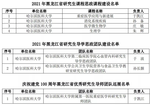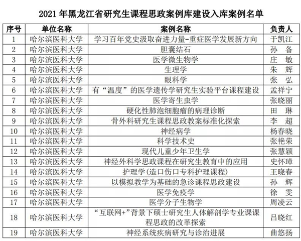 黑龍江經(jīng)濟(jì)網(wǎng)訊(黑龍江日報全媒體見習(xí)記者董廣碩 商祺)為貫徹落實國家《關(guān)于全面落實研究生導(dǎo)師立德樹人職責(zé)的意見》《高等學(xué)校課程思政建設(shè)指導(dǎo)綱要》《關(guān)于加快新時代研究生教育改革發(fā)展的意見》精神,按照《關(guān)于加快新時代黑龍江省研究生教育改革發(fā)展的實施意見》要求,日前,經(jīng)全省研究生培養(yǎng)單位遴選推薦,黑龍江省研究生課程思政教育聯(lián)盟專家委員會評審,省學(xué)位委員會、省教育廳批準(zhǔn),哈爾濱醫(yī)科大學(xué)共有26個項目獲批省級立項,其中研究生課程思政課程建設(shè)項目4個、研究生導(dǎo)學(xué)思政團(tuán)隊(導(dǎo)師)建設(shè)項目2個、研究生課程思政案例19個,慶祝建黨100周年巡展優(yōu)秀研究生導(dǎo)師團(tuán)隊1支。