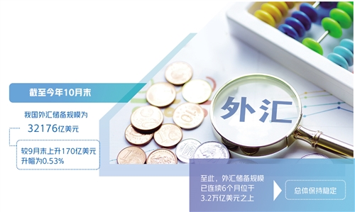 近日,國家外匯管理局公布的最新外匯儲(chǔ)備規(guī)模數(shù)據(jù)顯示,截至今年10月末,我國外匯儲(chǔ)備規(guī)模為32176億美元,較9月末上升170億美元,升幅為0.53%。至此,外匯儲(chǔ)備規(guī)模已連續(xù)6個(gè)月位于3.2萬億美元之上,總體保持穩(wěn)定。