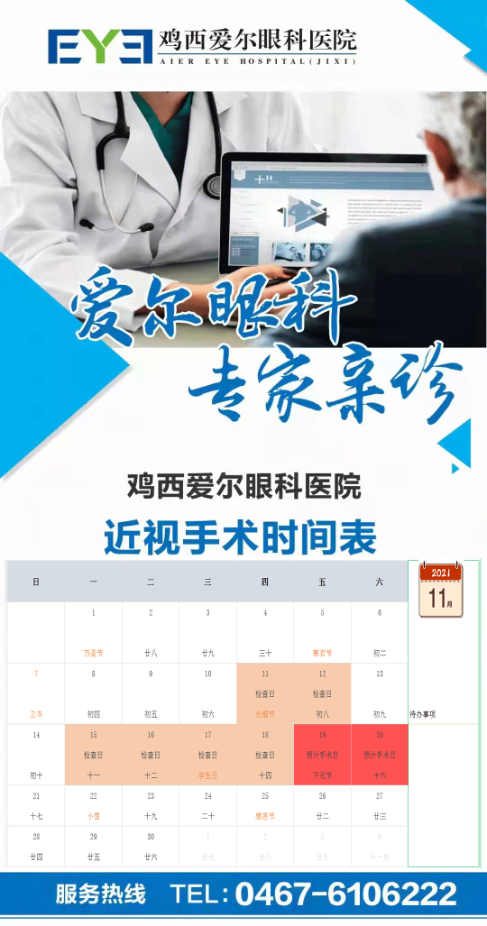 雞西愛(ài)爾眼科醫(yī)院近視手術(shù)時(shí)間表: