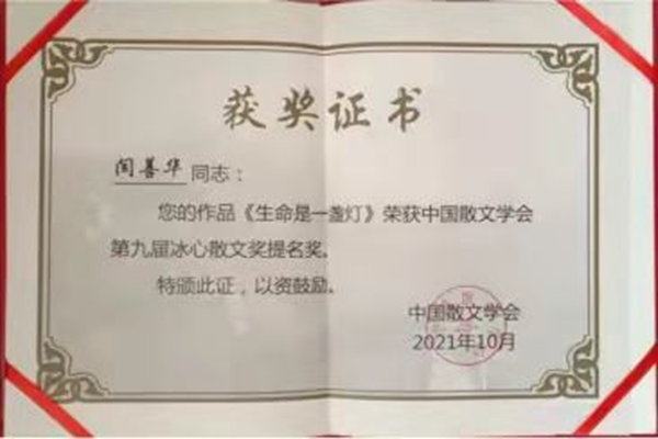 在幾十年的文學(xué)創(chuàng)作和編輯工作中,她不斷堅持學(xué)習(xí)提高,筆耕不輟,執(zhí)著堅守。在2020年10月發(fā)表在《北極光》上的散文《生命是一盞燈》,因主題對生命的感悟,用縱橫寬泛的思路、真摯的情感,流暢的文筆,經(jīng)評委嚴格評審,最終脫穎而出,獲得本屆冰心散文獎單篇提名獎。這對于一直深居邊陲縣城的一名作家,能邁進冰心散文獎這中國散文最高獎的大門,是一個非常難得的殊榮。