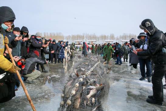 另外,杜爾伯特連環(huán)湖水產(chǎn)資源豐富,水產(chǎn)養(yǎng)殖業(yè)水域面積56萬多畝,湖內(nèi)盛產(chǎn)40種淡水魚類,尤以鯉魚、草魚、鰱魚、胖頭魚、鯽魚、黑魚等為多,年捕魚千余噸,冬網(wǎng)捕魚更是傳統(tǒng)習(xí)俗。連環(huán)湖溫泉景區(qū)冬季每天上午免費(fèi)開展民俗冬捕活動,購魚享受8折優(yōu)惠,還可以參與抽獎活動。