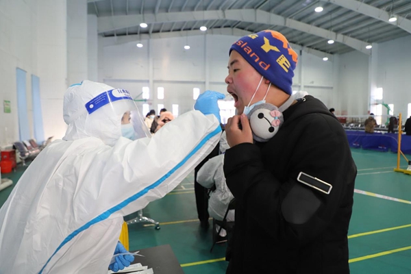 阿木爾鎮(zhèn)衛(wèi)生院醫(yī)務人員為居民采集核酸樣本(王力 攝)