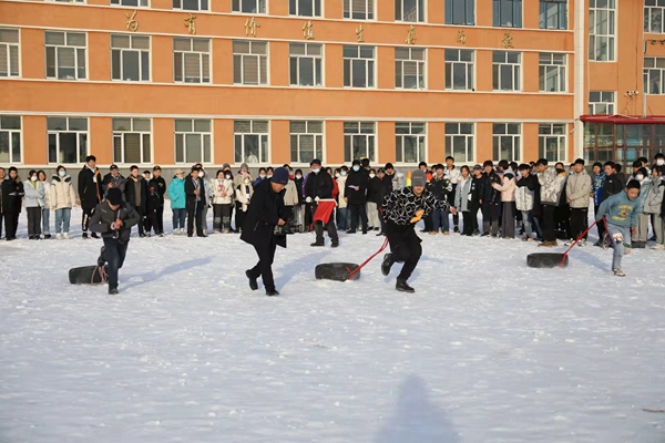 組織開展拉輪胎跑比賽。拉輪胎跑比賽在各年級(jí)間進(jìn)行,每班6名選手,50米往返,以時(shí)間少者為勝。隨著裁判老師一聲令下,比賽開始,選手們立馬拉起了輪胎奮力向前沖刺,克服雪地不利的條件,參賽選手飛快地向終點(diǎn)奔跑,掌聲、加油聲響徹操場。冬日的操場上,一個(gè)個(gè)