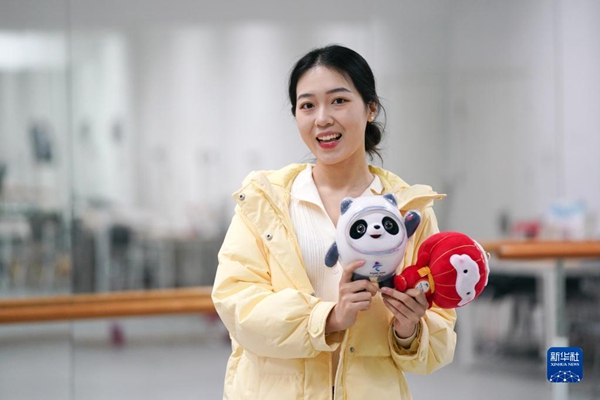 北京郵電大學的學生志愿者曹夢鴿手捧北京2022年冬奧會和冬殘奧會吉祥物做自我介紹(12月15日攝)。
