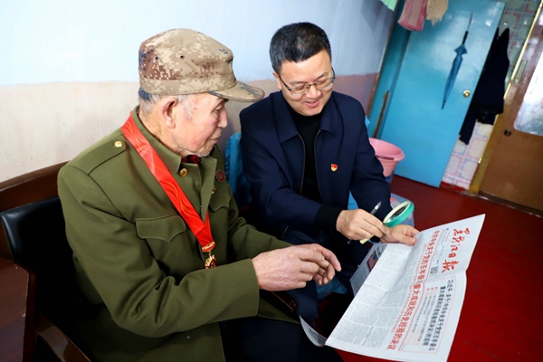 阿木爾林業(yè)局黨委委員、組織部部長(zhǎng)王立昆與退休老黨員張俊峰共同學(xué)習(xí)黨史(王力 攝)