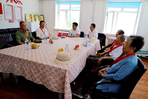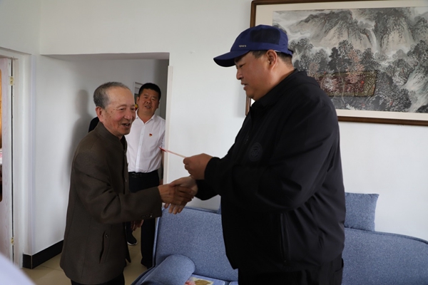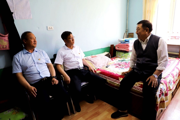 阿木爾林業(yè)局黨委副書(shū)記、局長(zhǎng)韓鳳泉(中)“七一”走訪(fǎng)慰問(wèn)退休老干部尹遜言(王力 攝)