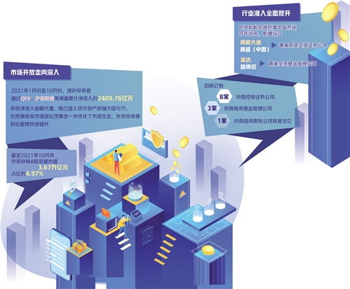 一系列開放舉措吸引了外資的高度關(guān)注和認(rèn)可,外資參與中國(guó)市場(chǎng)熱情高漲,在華投資展業(yè)活動(dòng)加快推進(jìn)。截至2021年10月末,外資持有A股流通市值3.67萬億元,占比約4.97%。