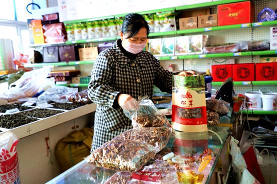 藍(lán)領(lǐng)山特產(chǎn)品店經(jīng)營(yíng)業(yè)主高桂杰正在為客戶(hù)備貨。