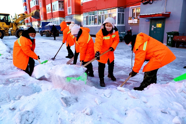 在清掃過程中,環(huán)衛(wèi)職工冒著零下30多度的嚴寒,移動車輛、鏟除積雪、揮舞工具,僅用40多分鐘完成了一棟樓前硬化地面的清理任務(wù)。