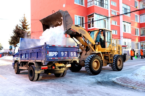 鑒于此,林業(yè)局環(huán)衛(wèi)隊組織10多名環(huán)衛(wèi)工,出動兩臺翻斗車、一臺裝載機,對28棟居民樓房前的硬化地面積雪進行“大掃除”,擴大步行道面積,方便居民出行。