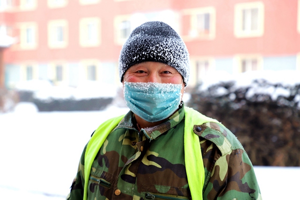 阿木爾林業(yè)局環(huán)衛(wèi)隊職工單廣躍冒嚴寒清理生活垃圾,口罩、帽子上結(jié)滿冰霜(王力 攝)