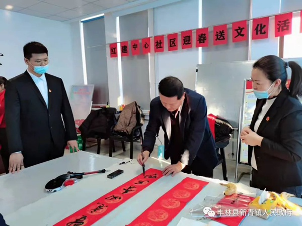 1月18日,豐林縣文聯(lián)邀請(qǐng)了該縣書法家協(xié)會(huì)會(huì)員及書法藝術(shù)愛好者6人,深入到新青鎮(zhèn)所轄社區(qū)現(xiàn)場(chǎng)為居民書寫并贈(zèng)送春聯(lián)和福字。在新青鎮(zhèn)紅建社區(qū),書法家們揮毫潑墨,奮筆疾書,紅幅鋪展、妙句成雙,滿室濃墨飄香,到處洋溢著春的氣息。