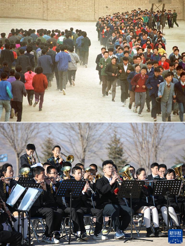 拼版照片:上圖為2001年,會(huì)寧縣二中學(xué)生跑步鍛煉身體(新華社記者 武斌 攝);下圖為2022年1月19日,會(huì)寧縣會(huì)師中學(xué)交響管樂(lè)團(tuán)學(xué)生在戶外表演交響樂(lè)(新華社記者 馬希平 攝)。