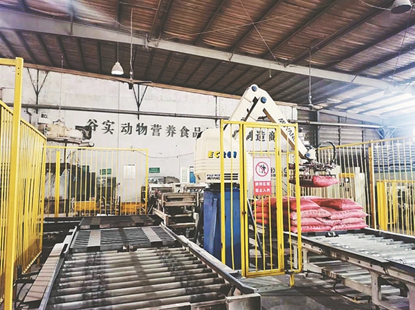 谷實(shí)生物集團(tuán)股份有限公司車間里的機(jī)器人碼垛設(shè)備。