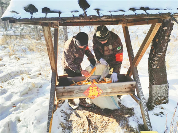 同一時間,青山林場的巡護隊員來到53林班補飼點,貼福字,送“年貨”。“這過年了,狍子野豬的食物也得提檔升級。咱們過年吃餃子,它們也得吃點好的?!标爢T王振林邊擺放著玉米、豆餅粉、白菜、蘿卜等食物邊調侃著。