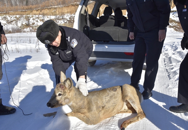 2月2日,正值大年初二,塔河縣公安局森保大隊民警接到鎮(zhèn)內(nèi)群眾的報警求助電話,稱一只疑似狍子的野生動物誤闖進自己家倉庫院內(nèi),民警立刻趕往現(xiàn)場。到達現(xiàn)場后,民警判斷這是一只成年狍子。報警群眾稱和親戚費了不少勁才把這只誤闖居民區(qū)的袍子抓住,為了防止其亂跑受到意外傷害專門用繩子將其腿系住,然后立刻報了警。經(jīng)過仔細查驗,森保民警確認袍子沒有明顯傷病。在精心照顧和觀察了兩個小時后,看到其行動能力正常,精神狀態(tài)良好,符合放生條件后,森保大隊民警和報警群眾將這只狍子放歸了大自然。“拜年”狍子在完成了自己的心愿后在人們的目送下歡快地回歸了山林。