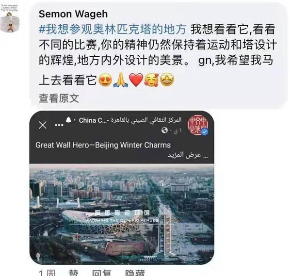 2022年年初,根據(jù)埃及社會(huì)、文化特點(diǎn)和民眾喜好,開(kāi)羅中國(guó)文化中心創(chuàng)新推出了2022“北方冰雪旅游海外推廣季”之“我最想去的地方”線上評(píng)選活動(dòng),邀請(qǐng)埃及各界友人參與話題互動(dòng),在中心主題帖文下寫(xiě)出自己最想去的中國(guó)省份(或城市)及原因,曬出旅游目的地圖片并打上話題標(biāo)簽等?;顒?dòng)一經(jīng)推出,即受到埃及民眾的廣泛關(guān)注,網(wǎng)友們紛紛在中心臉書(shū)帖文下留言并轉(zhuǎn)發(fā),評(píng)選自己“最想去的中國(guó)冰雪旅游勝地”,并熱情附上自己之前在華留學(xué)、訪問(wèn)、旅游、生活的旅游體驗(yàn)和文化閱歷,活動(dòng)二次外溢效應(yīng)明顯,二次傳播效果良好,旅游推廣和文化傳播的效果遠(yuǎn)遠(yuǎn)高于預(yù)期?;顒?dòng)期間,該活動(dòng)