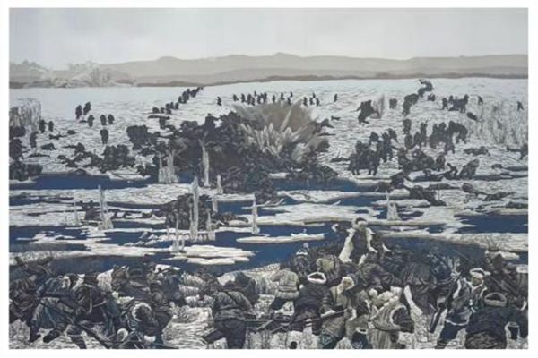 版畫(huà)作品《冰趟子戰(zhàn)役中的趙尚志》實(shí)景再現(xiàn)了東北抗日聯(lián)軍殲敵最多的著名戰(zhàn)役一一冰趟子戰(zhàn)役,展現(xiàn)了趙尚志同志指揮若定、英勇殲敵的英雄形象。抗聯(lián)戰(zhàn)士借助冰趟子封凍這一東北地區(qū)特有的有利地形,化被動(dòng)為主動(dòng),對(duì)尾追日軍進(jìn)行伏擊,殲滅大量日軍。體現(xiàn)了東北抗聯(lián)在極其惡劣的條件下,捍衛(wèi)中華民族的無(wú)畏斗爭(zhēng)精神。