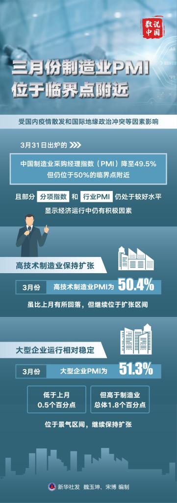 新華社北京3月31日電 (記者 魏玉坤)受國內(nèi)疫情散發(fā)和國際地緣政治沖突等因素影響,31日出爐的中國制造業(yè)采購經(jīng)理指數(shù)(PMI)降至49.5%,但仍位于50%的臨界點附近,且部分分項指數(shù)和行業(yè)PMI仍處于較好水平,顯示經(jīng)濟運行中仍有積極因素。