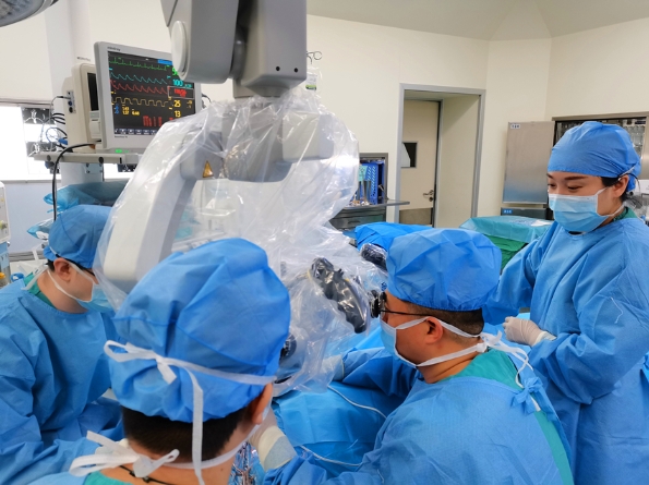 檢查結(jié)果出來后,孫國章主任醫(yī)師建議王女士行右側(cè)顳葉占位切除并行病理檢查。與家屬詳細交代手術(shù)的必要性及相關(guān)風險,患者家屬表示知情同意行手術(shù)治療。術(shù)前準備完畢后,孫國章主任醫(yī)師為王女士在全麻下進行了右側(cè)顳葉占位切除+血腫清除術(shù),術(shù)中孫國章主任醫(yī)師在顯微鏡下仔細分離腫瘤組織與腦組織邊界,將腫瘤組織全切并將血腫全部清除,手術(shù)過程順利。王女士術(shù)后恢復(fù)良好,頭部CT復(fù)查顯示腫瘤完全切除,血腫清除徹底,病理回報為腦膠質(zhì)母細胞瘤,現(xiàn)已出院準備進行放化療等下一步綜合治療。