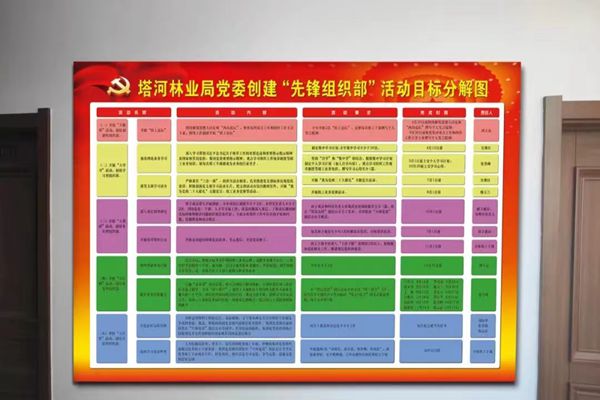 掛圖“作戰(zhàn)”,統(tǒng)籌指導(dǎo)。塔河林業(yè)局黨委組織部結(jié)合自身實際制定了《塔河林業(yè)局黨委創(chuàng)建“先鋒組織部”實施方案》;緊緊圍繞集團黨委下發(fā)方案中的“五大”活動和九項具體工作內(nèi)容制定目標分解展示圖,詳細列出了活動內(nèi)容、活動要求、完成時限,秉承誰具體負責,誰統(tǒng)籌推進,誰跟蹤問效的的原則,將責任落實到人頭,時刻督促每名組工干部及時完成目標任務(wù),凝心聚力,共同打造講政治、重公道、業(yè)務(wù)精、作風好的組工干部隊伍。