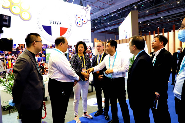 阿木爾林業(yè)局北極冰藍(lán)莓酒莊生產(chǎn)的冰酒、紅酒等產(chǎn)品,在第四屆上海國際進(jìn)出口博覽會上展出。大興安嶺林業(yè)集團(tuán)公司黨委副書記、總經(jīng)理李軍(左五)與國際友人及林業(yè)局參展人員親切交談,了解酒莊產(chǎn)品特點(diǎn)、市場營銷等情況(王力 攝)