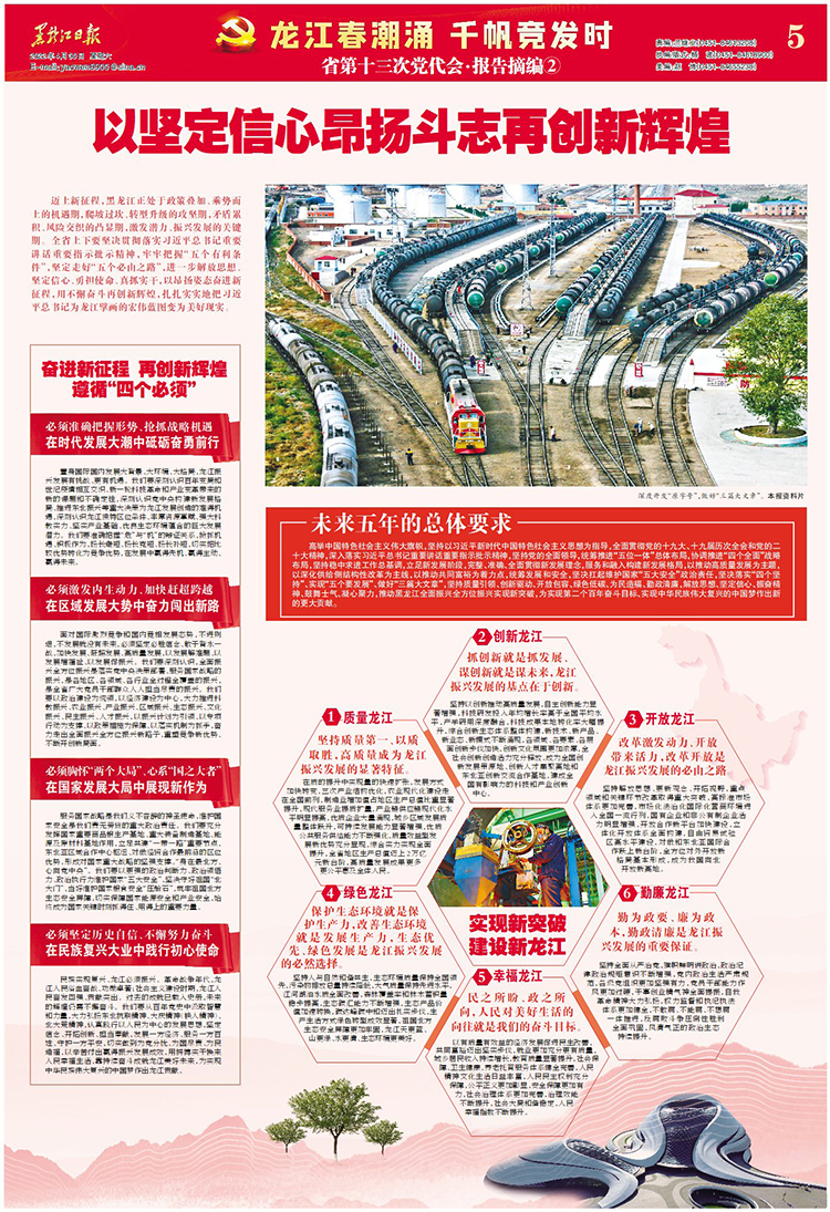 邁上新征程,黑龍江正處于政策疊加、乘勢而上的機遇期,爬坡過坎、轉(zhuǎn)型升級的攻堅期,矛盾累積、風(fēng)險交織的凸顯期,激發(fā)潛力、振興發(fā)展的關(guān)鍵期。全省上下要堅決貫徹落實習(xí)近平總書記重要講話重要指示批示精神,牢牢把握“五個有利條件”,堅定走好“五個必由之路”,進一步解放思想、堅定信心、勇?lián)姑?、真抓實干,以昂揚姿態(tài)奮進新征程,用不懈奮斗再創(chuàng)新輝煌,扎扎實實地把習(xí)近平總書記為龍江擘畫的宏偉藍圖變?yōu)槊篮矛F(xiàn)實。