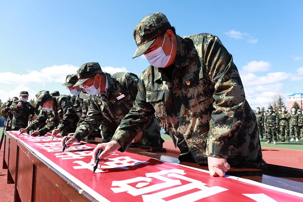阿木爾林業(yè)局處級領(lǐng)導(dǎo)在印有“牢記歷史 警鐘長鳴 奮發(fā)圖強(qiáng) 建設(shè)美麗家園”的宣傳條幅上簽名(王力 攝)