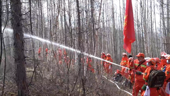 鏡頭二:由林業(yè)局黨委書記魯智勇,黨委委員、工會主席任志遠組成的森林防火前線指揮部,根據無人機回傳的實時畫面,果斷下達撲救命令。他們結合氣象條件,采取“兩翼對進,鉗形夾擊”的撲火戰(zhàn)術,運用常規(guī)風力滅火和以水滅火相配合的方式組織撲救。